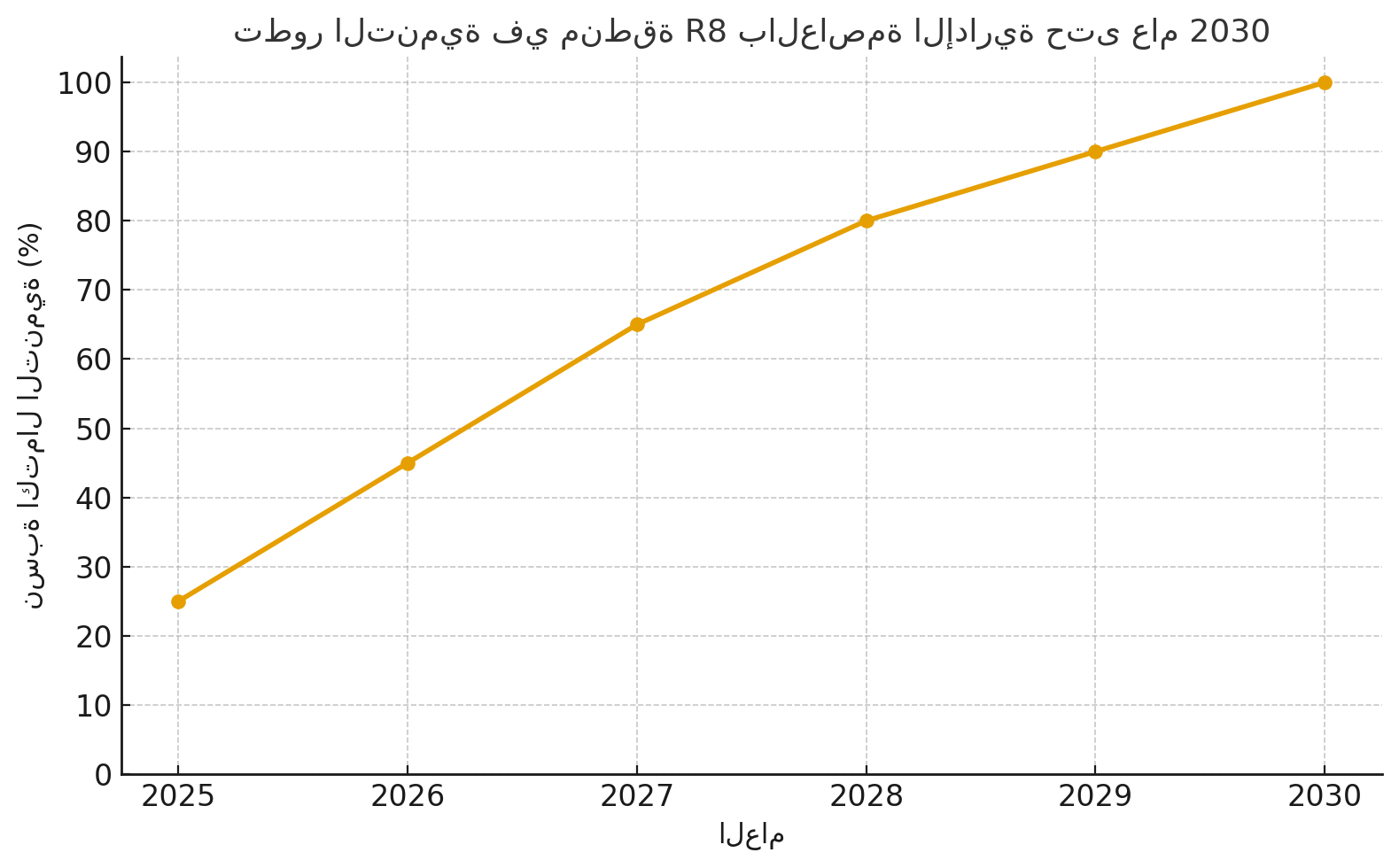 يوضح معدل تطور التنمية في منطقة R8 بالعاصمة الإدارية الجديدة من 2025 حتى 2030،
