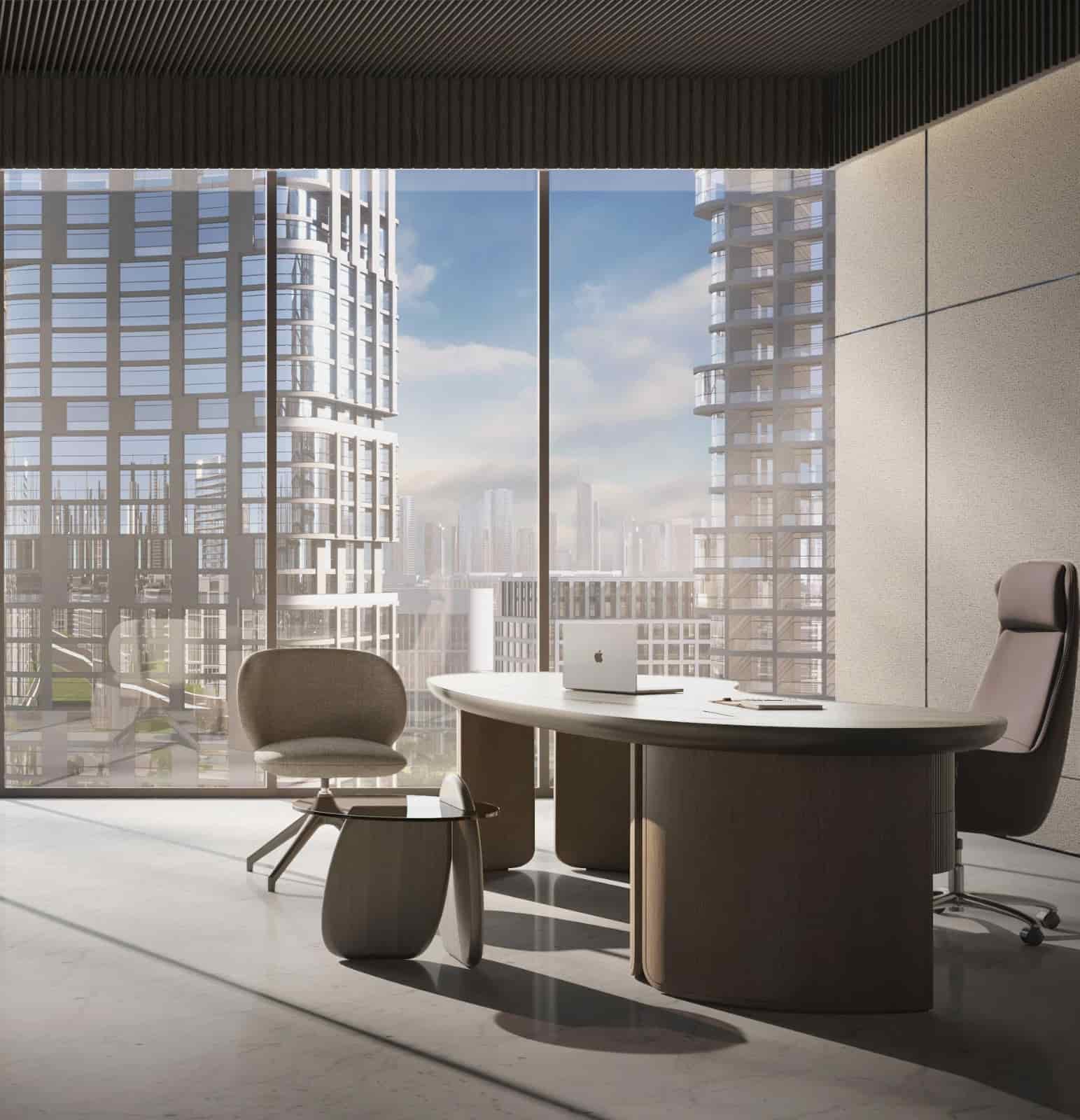 The interior design of the project reflects a perfect harmony between nature and technology; green landscapes surround the buildings, calm pathways connect the towers, and expansive glass windows open onto a dazzling view of the New Administrative Capital.