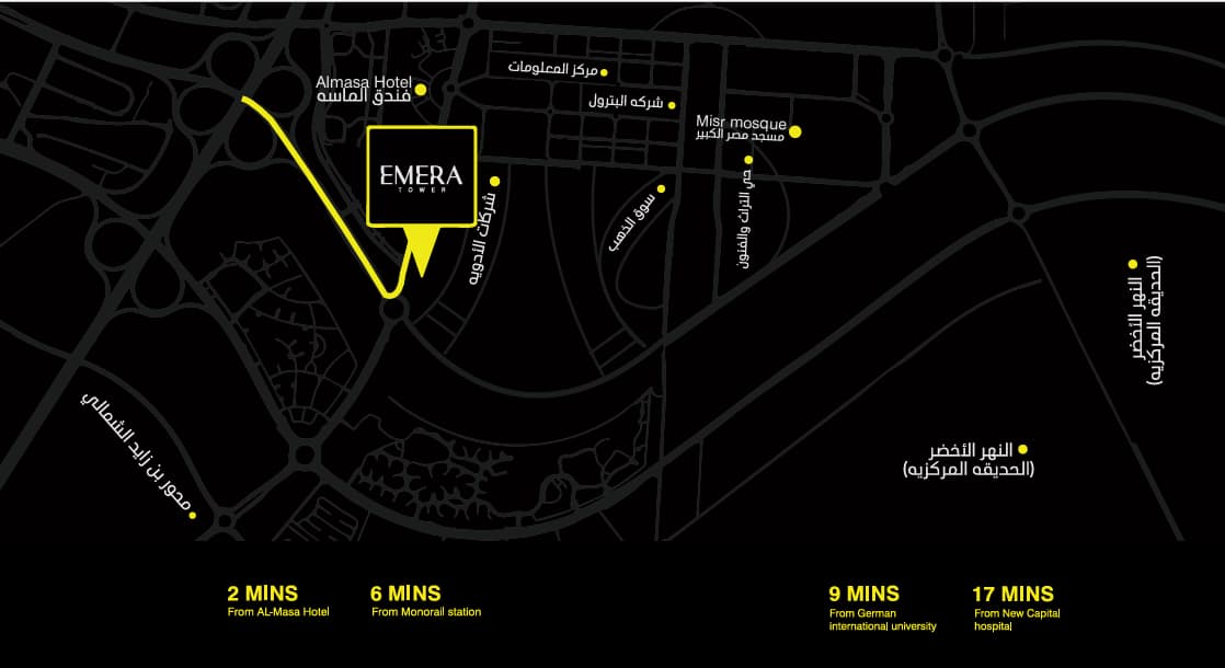 إذن موقع Emera Tower هو ما تبحث عنه. إذ يتمتع البرج بموقع استراتيجي مميز داخل قلب منطقة الداون تاون المنطقة الأشهر والأكثر حيوية في العاصمة الجديدة ليكون نقطة اتصال مثالية بين أهم المحاور والخدمات الرئيسية.يقع المشروع على المحور المركزي بعرض 70 متر المتوازي مع المحور الغربي للداون تاون.مما يوفر سهولة حركة وانسيابية مرور تسهل الوصول إليه من مختلف مناطق العاصمة.