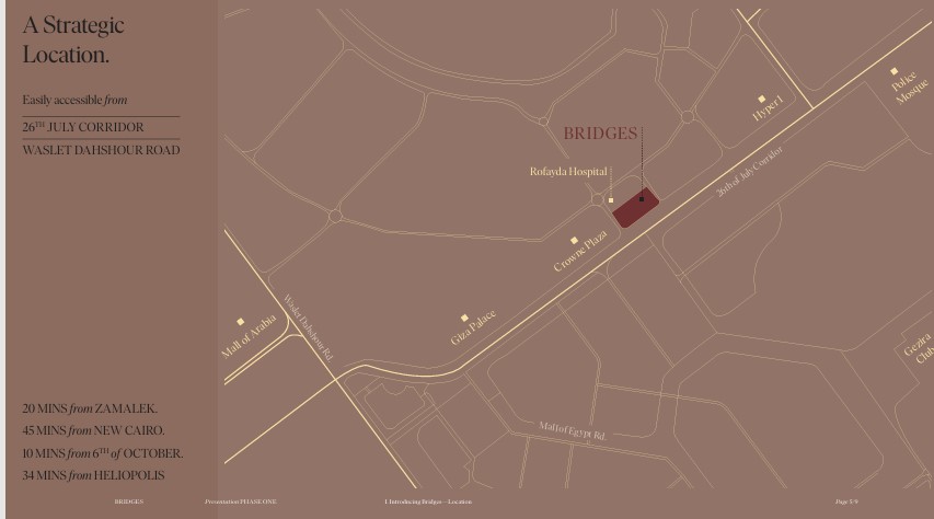يتميز مول بريدجز الشيخ زايد (Bridges Mall Sheikh Zayed) بموقع استراتيجي فريد في قلب مدينة الشيخ زايد، حيث يقع مباشرة على محور 26 يوليو وبالقرب من وصلة دهشور، ليجمع بين سهولة الوصول والحيوية اليومية في واحدة من أهم مناطق غرب القاهرة.يقع المشروع أمام مستشفى رفيدة (Rofayda Hospital)، وعلى بُعد خطوات من فندق كراون بلازا وهايبر وان، كما تحيط به مجموعة من الكمبوندات الراقية مثل جيزة بالاس وجيزة كلوب، مما يخلق بيئة نشطة وجاذبة للحركة طوال اليوم.