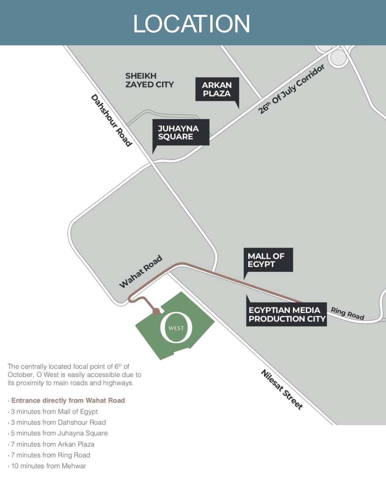 - يقع المشروع على طريق الواحات مباشرة بمدينة 6 أكتوبر، بالقرب من مول مصر، ميدان جهينة، وطريق دهشور.