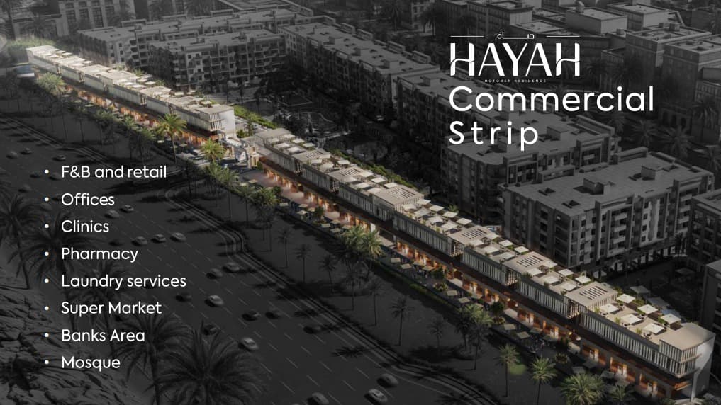 ومن أبرز عناصر المشروع أيضًا HAYA Walk Strip Mall وهو مول تجاري يمتد على واجهة المشروع بالكامل بارتفاع أرضي + طابقين (G+2)، ويضم مجموعة متنوعة من الوحدات التي تخدم سكان الكمبوند والمنطقة المحيطة، وتشمل: