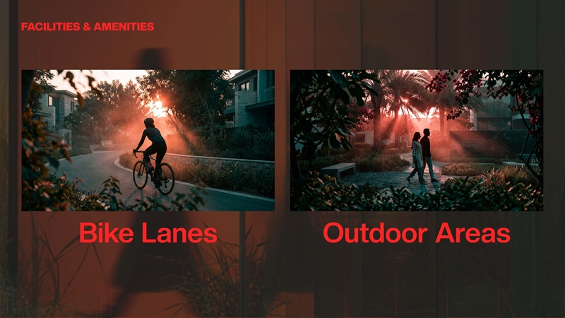 - مسارات للدراجات والتنزه: مساحات خارجية واسعة ومسارات مخصصة لممارسة رياضة المشي وركوب الدراجات في أمان تام.