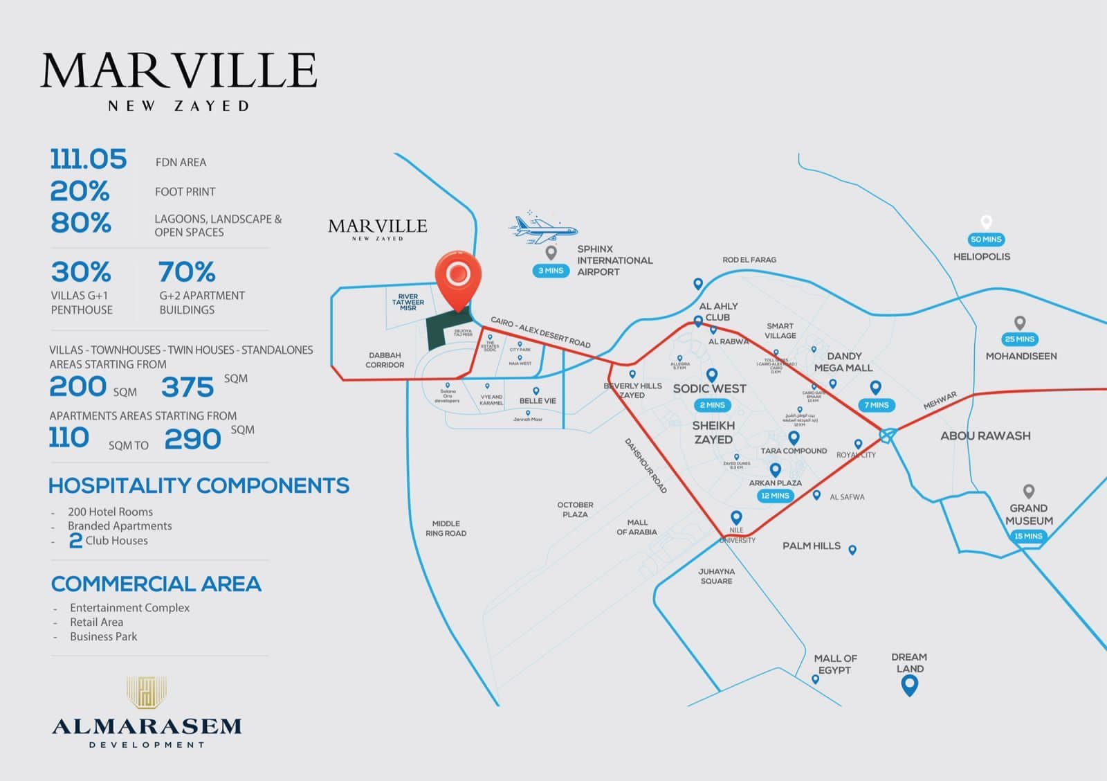 يُقام مشروع مارفيل زايد الجديدة – Marville New Zayed على مساحة ضخمة تبلغ 110 فدان صُممت لتجسّد مفهوم الحياة الفاخرة بمعناها الحقيقي.