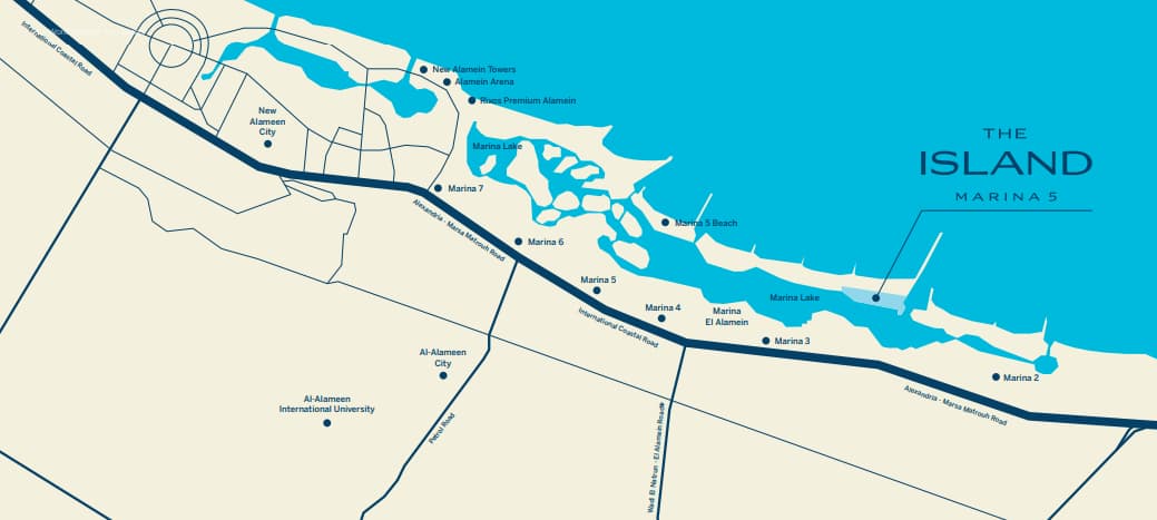 يقع مشروع ذا ايلاند مارينا 5 في الجزيرة 22 بمنطقة لسان الوزراء بالعلمين موقع استراتيجي يجمع بين جمال البحر وسحر بحيرة العلمين مما يمنحك تجربة حياة فريدة وسط الطبيعة الخلابة.